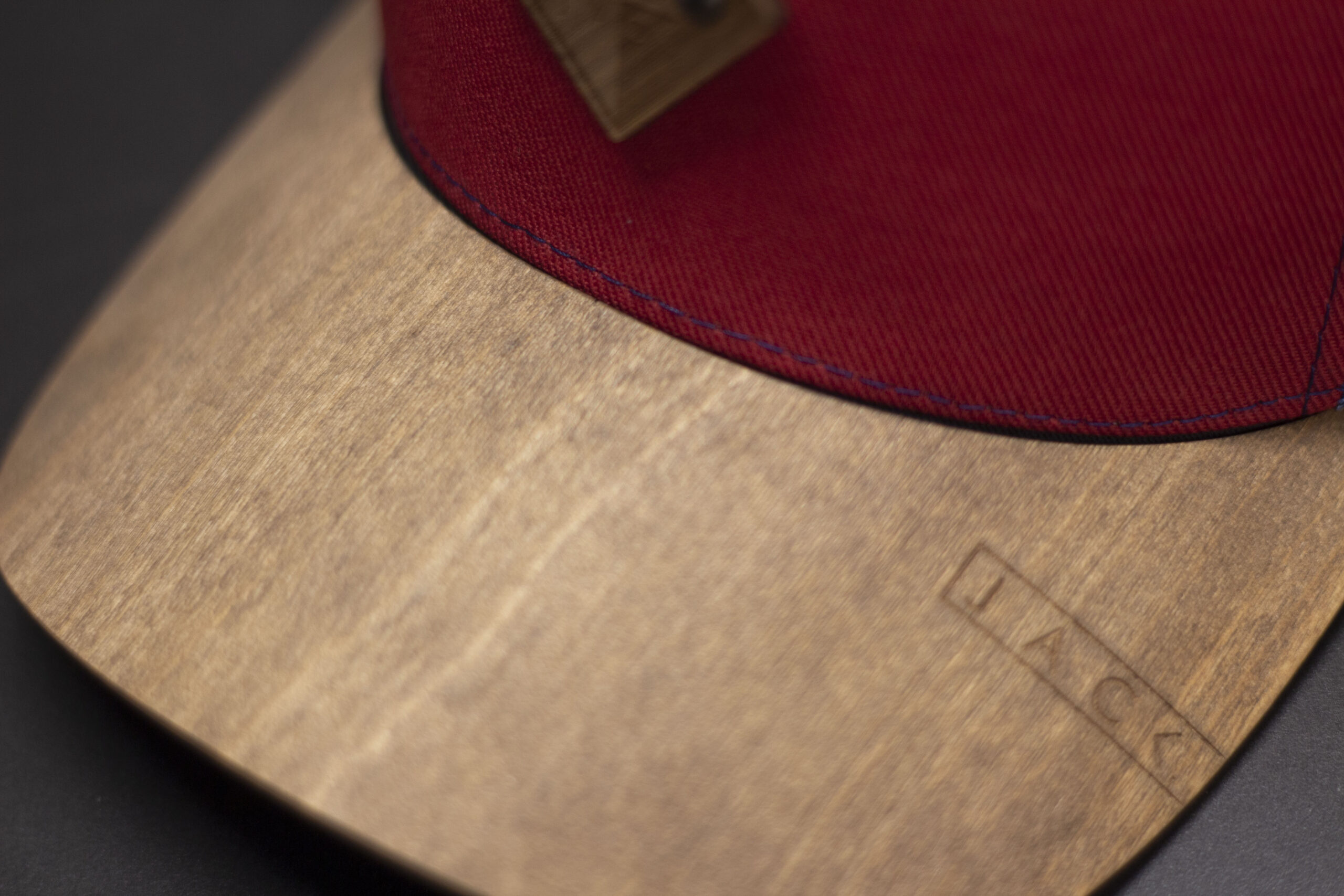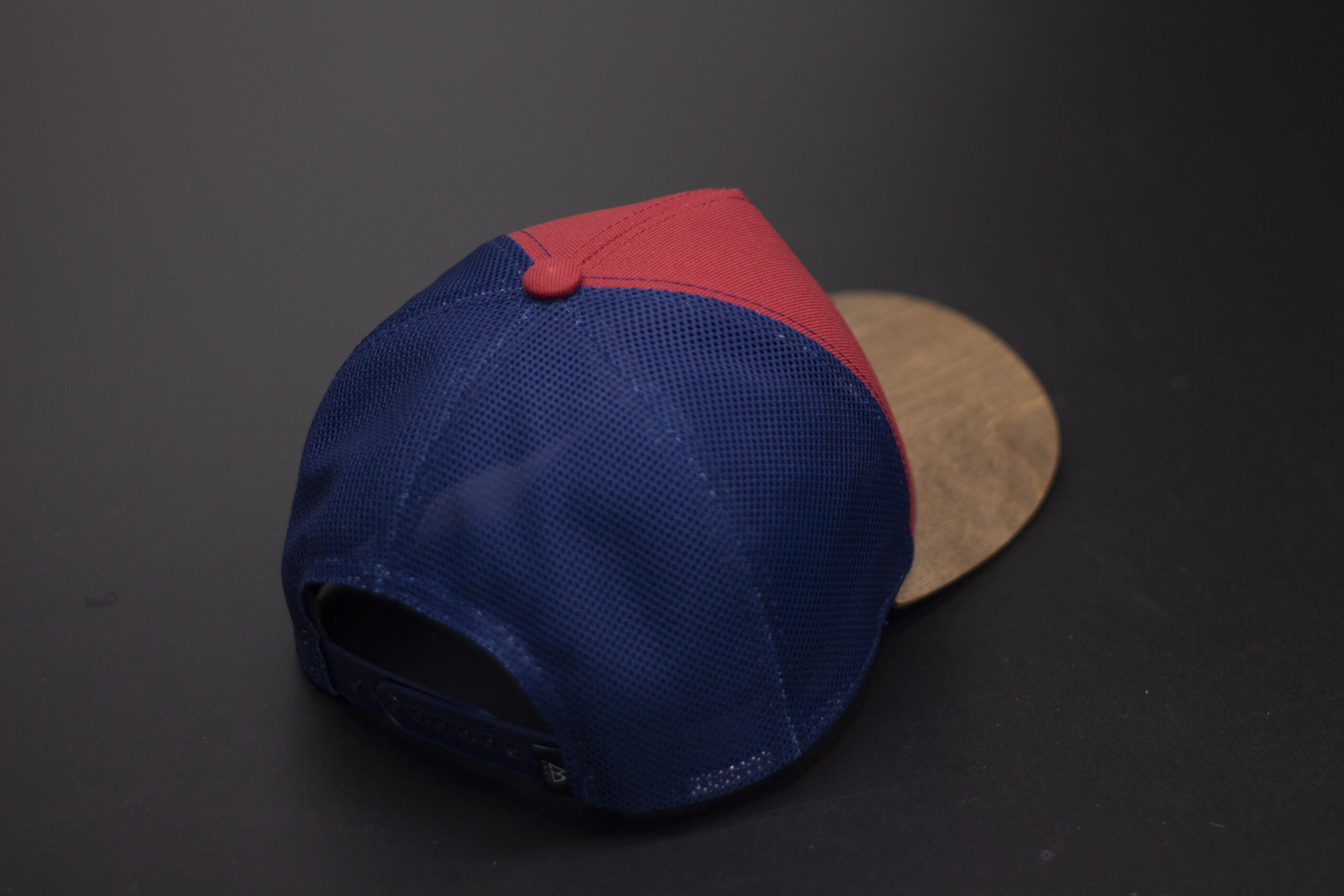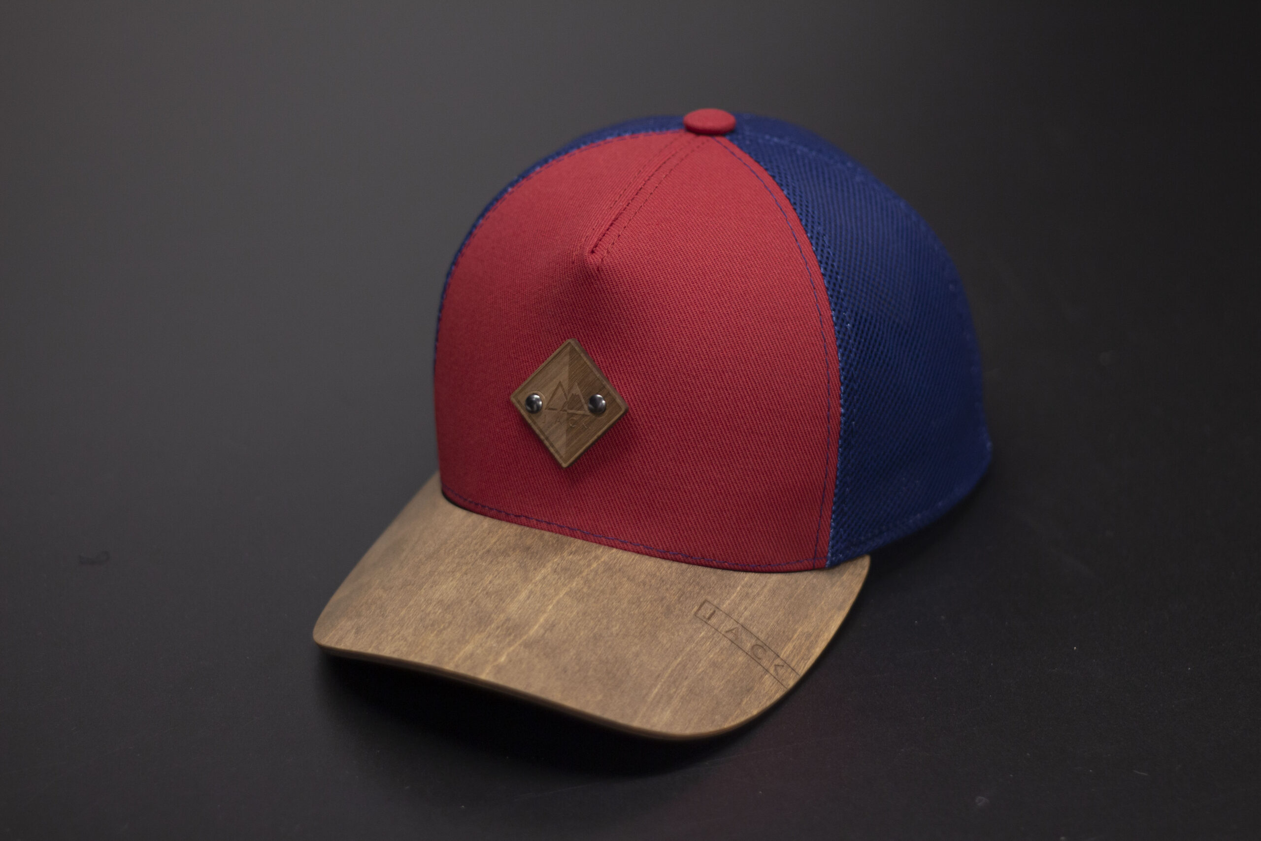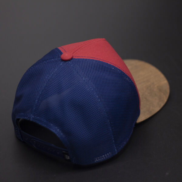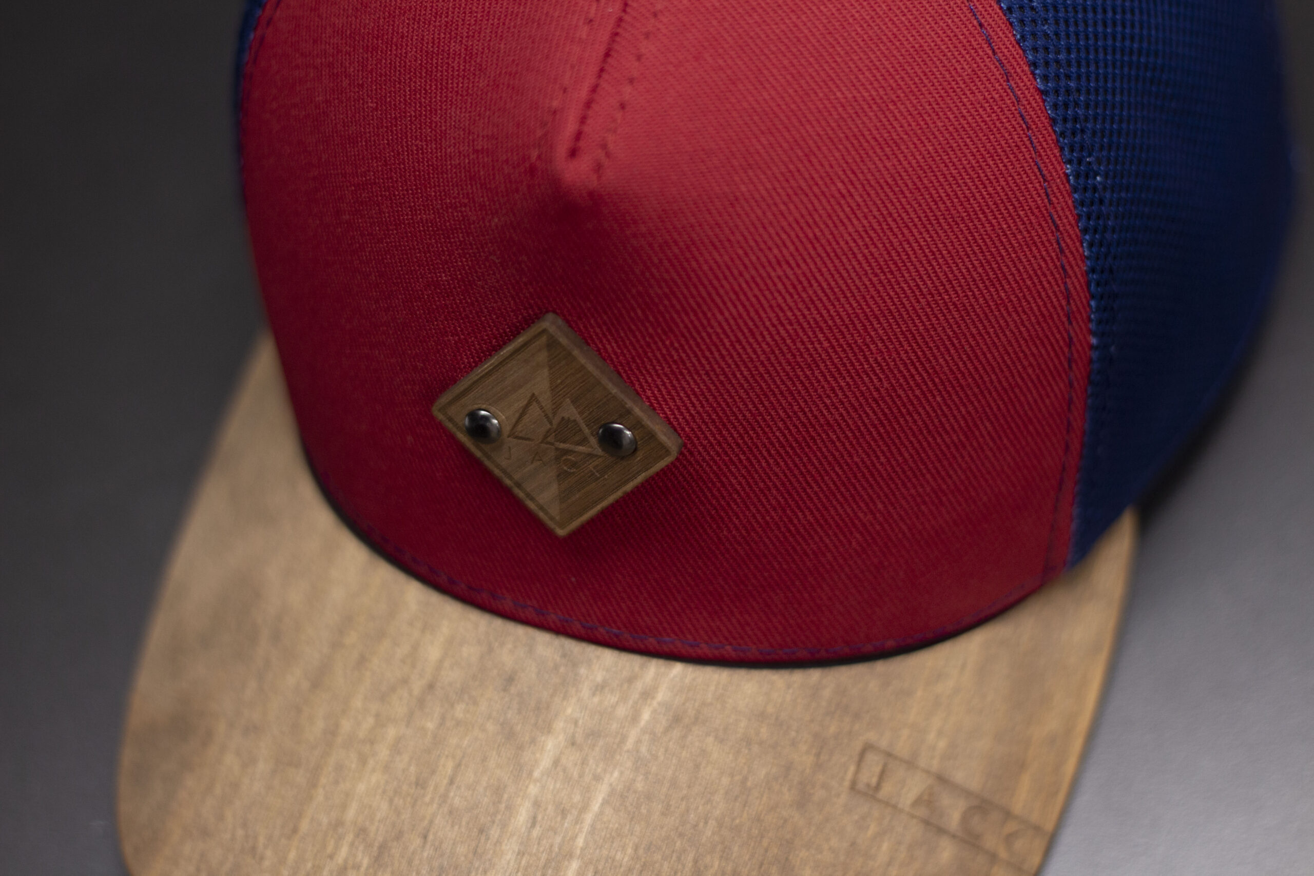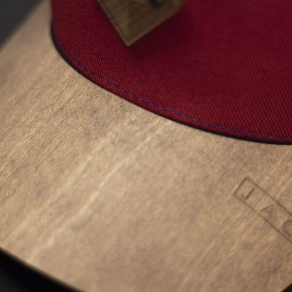 Czapka baseball w kolorze bordowym z niebieską siatką i brązowym drewnianym daszkiem wykonanym z prawdziwego drewna. Na froncie znajduje się drewniany emblemat mocowany nitami, który nadaje czapce charakter premium. Model łączy klasyczny krój baseballówki z naturalnym, unikalnym wykończeniem. Idealna na lato, wyjazdy, rower i codzienne noszenie.