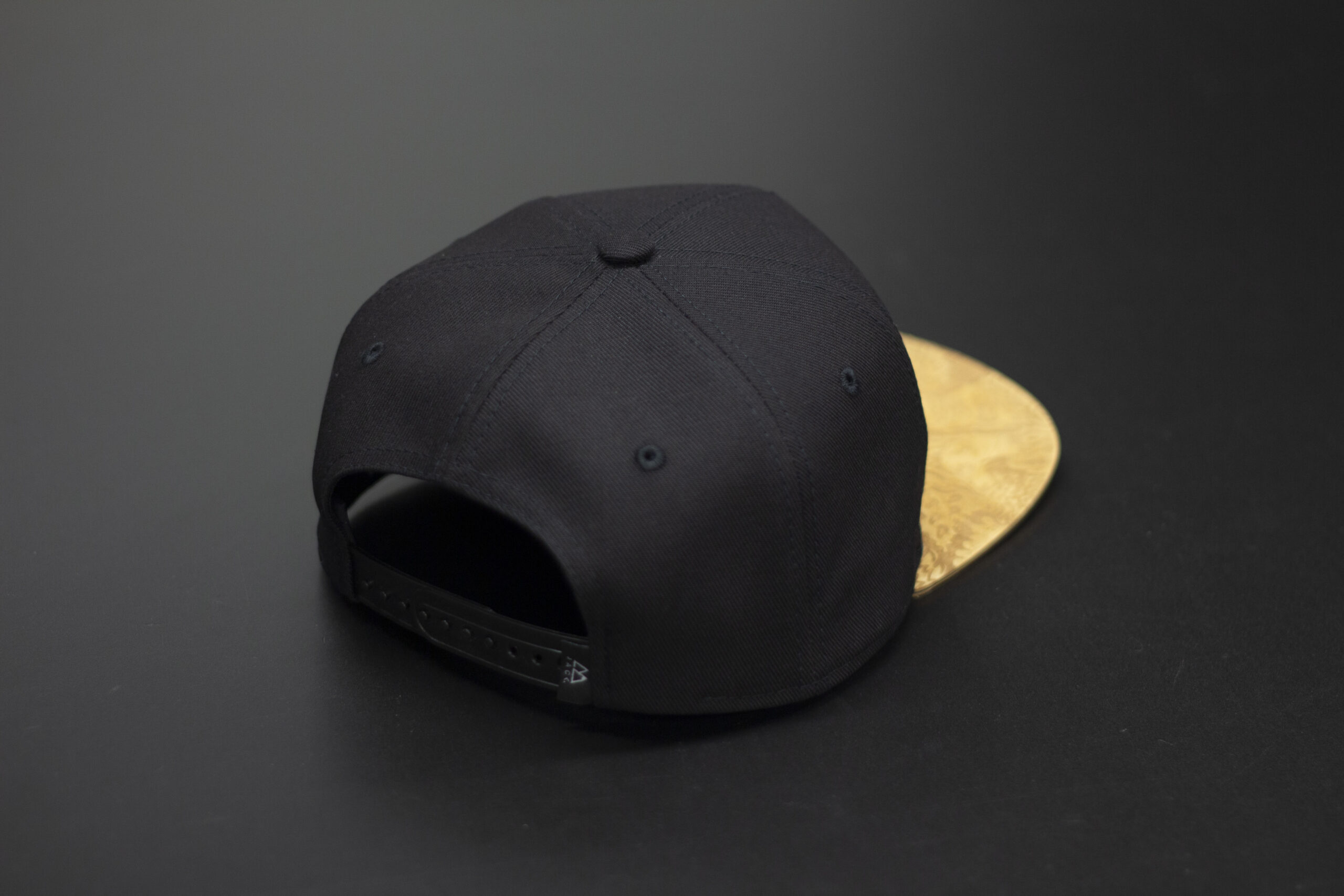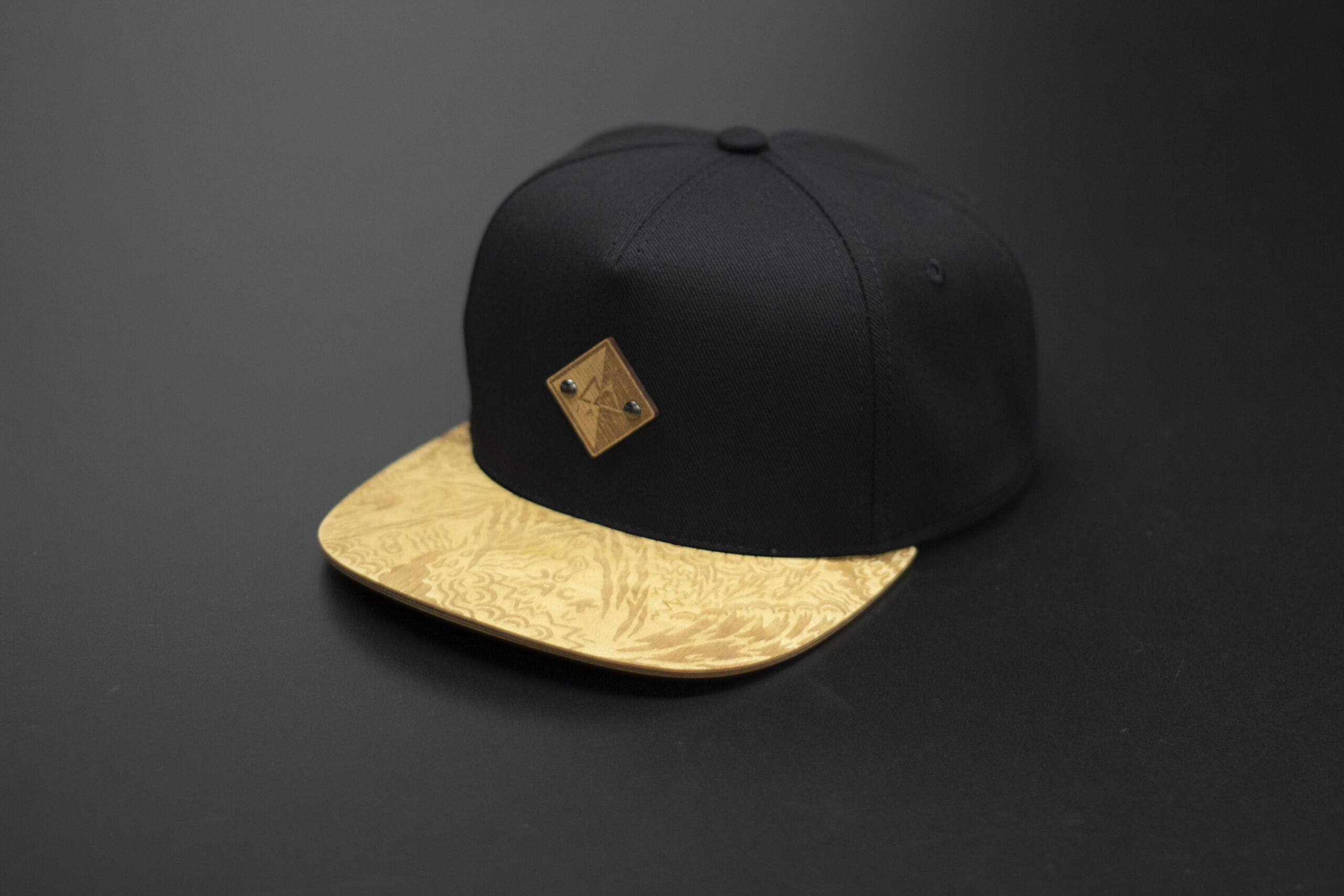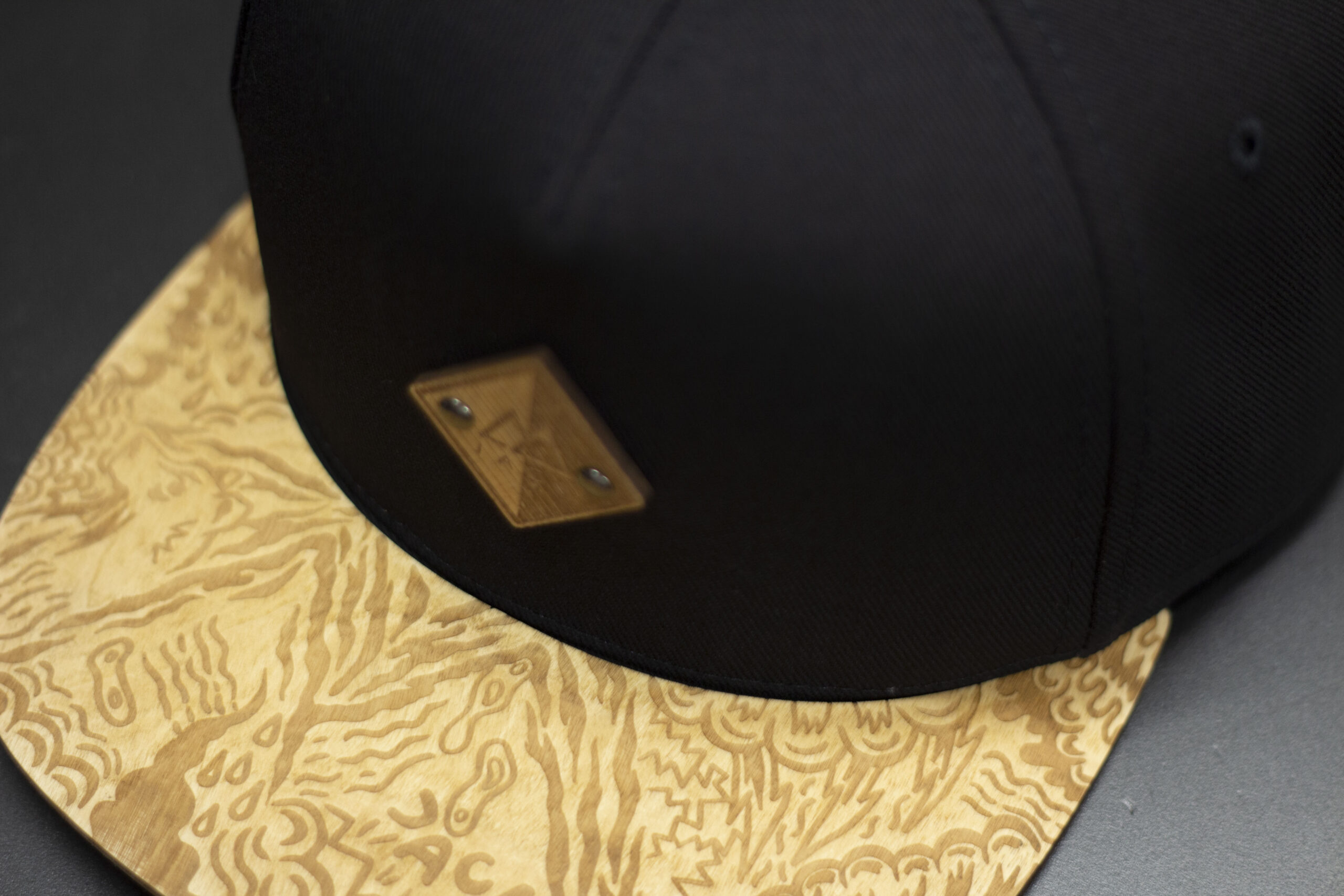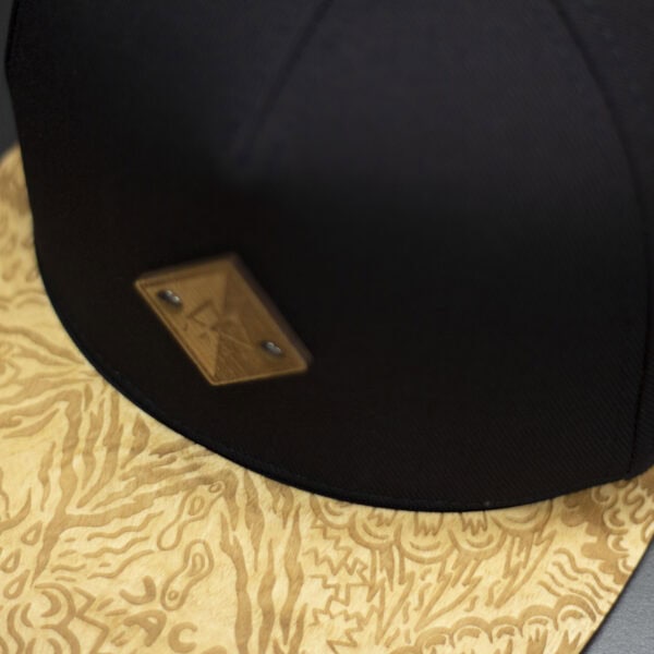 Czapka snapback w kolorze czarnym z jasnym brązowym drewnianym daszkiem wykonanym z prawdziwego drewna. Na froncie znajduje się drewniany emblemat mocowany nitami, nadający całości premium charakter. Model łączy streetwear z naturalnym wykończeniem i wyróżnia się unikalnym stylem. Idealna na miasto, wyjazdy i codzienne noszenie.
