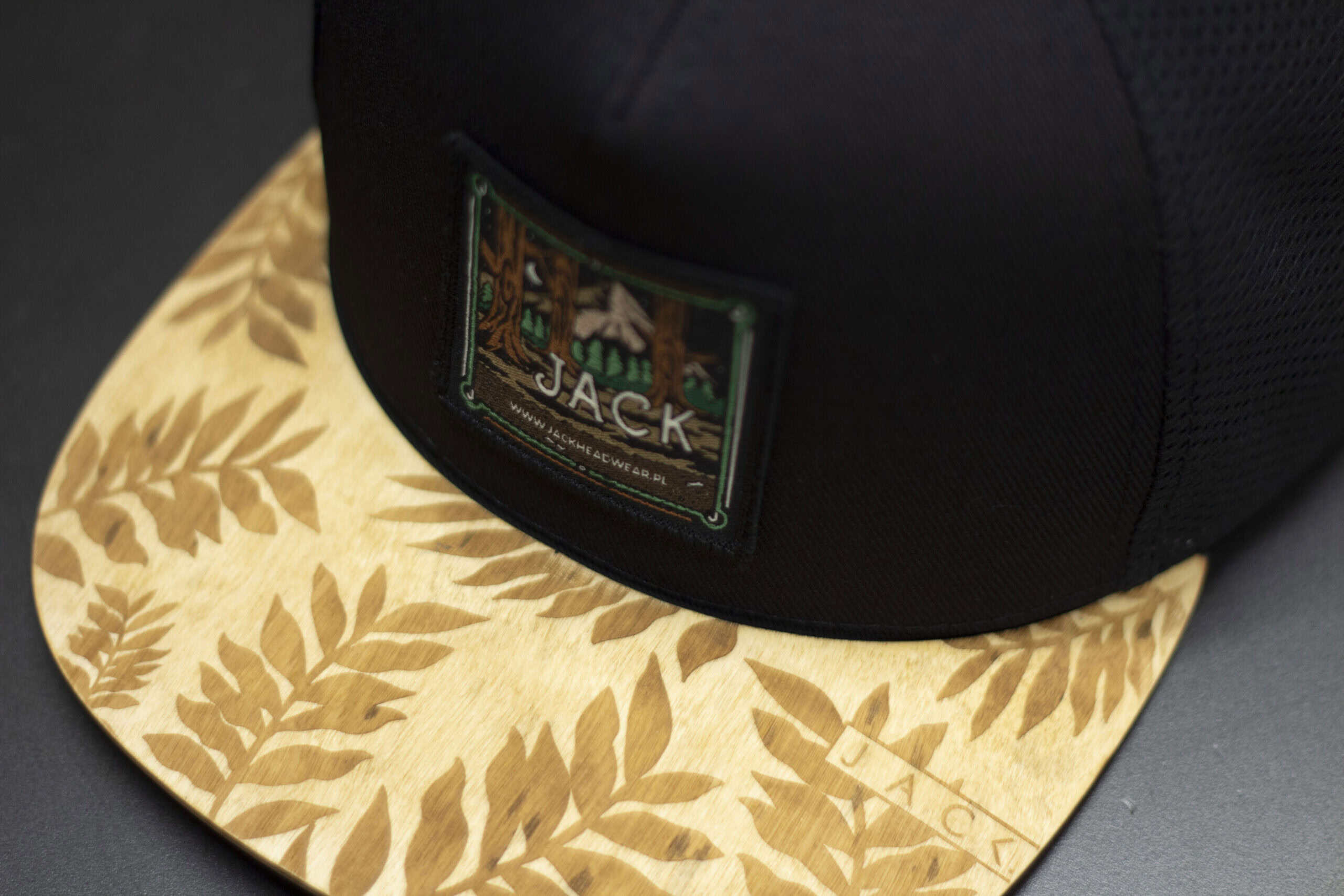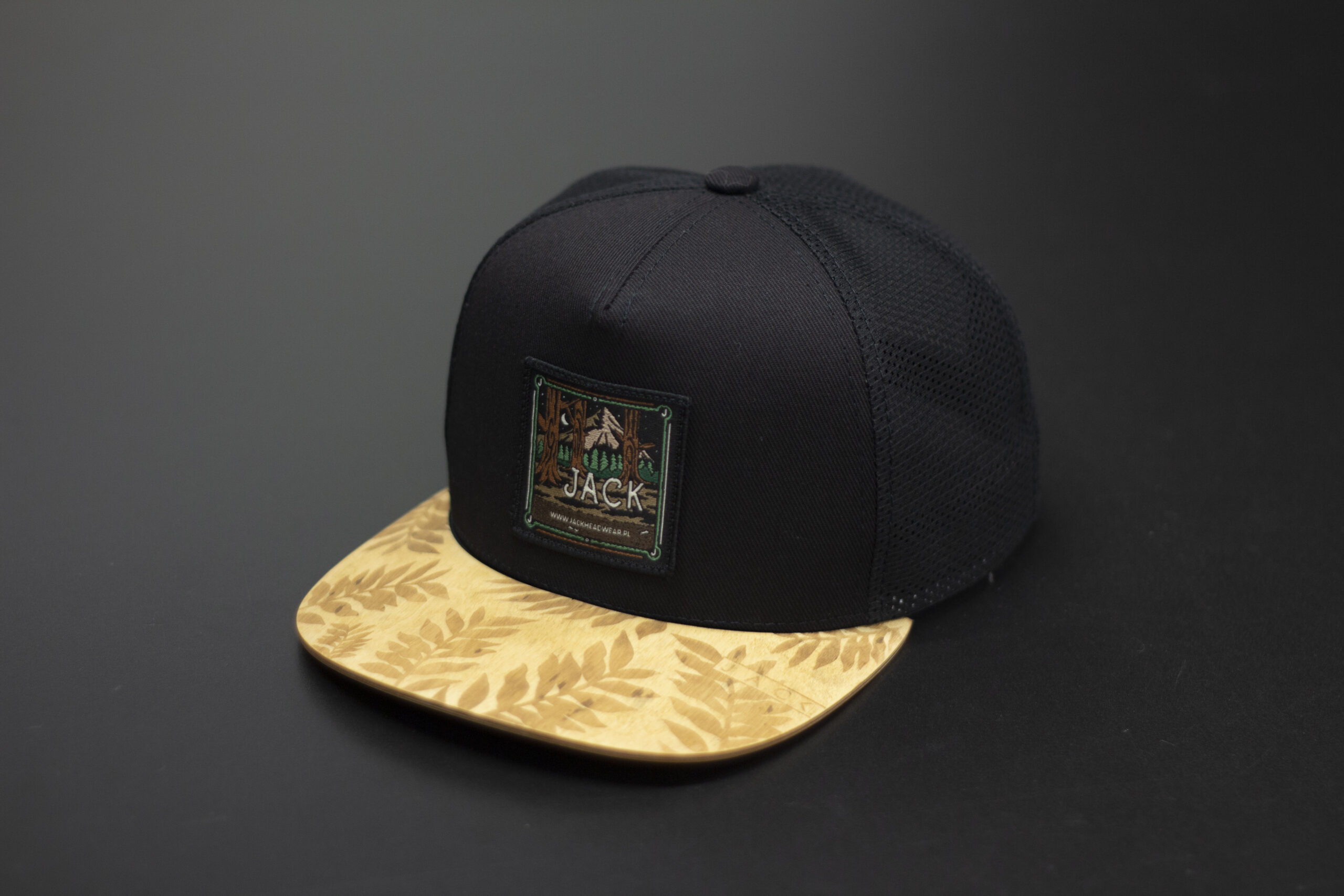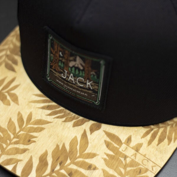 Czapka trucker w kolorze czarnym z czarną siatką i brązowym drewnianym daszkiem wykonanym z prawdziwego drewna. Model łączy outdoorowy styl z nowoczesnym streetwearem. Na froncie znajduje się prostokątna brązowa naszywka z motywem górskim i logo Jack Headwear. Idealna na lato, wyjazdy, rower i codzienne noszenie.