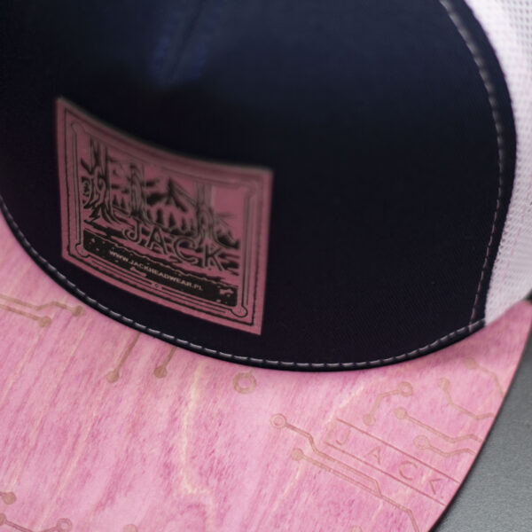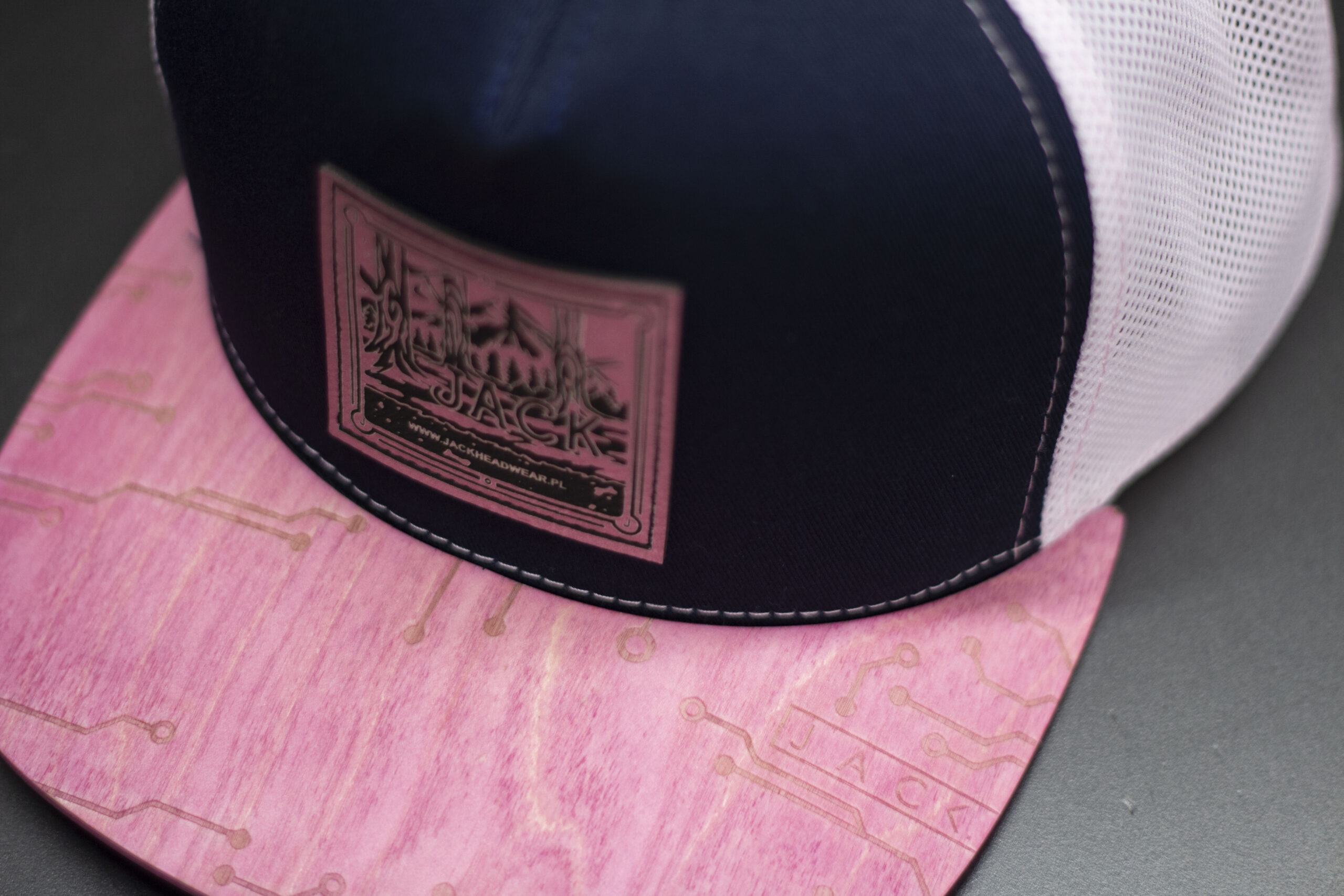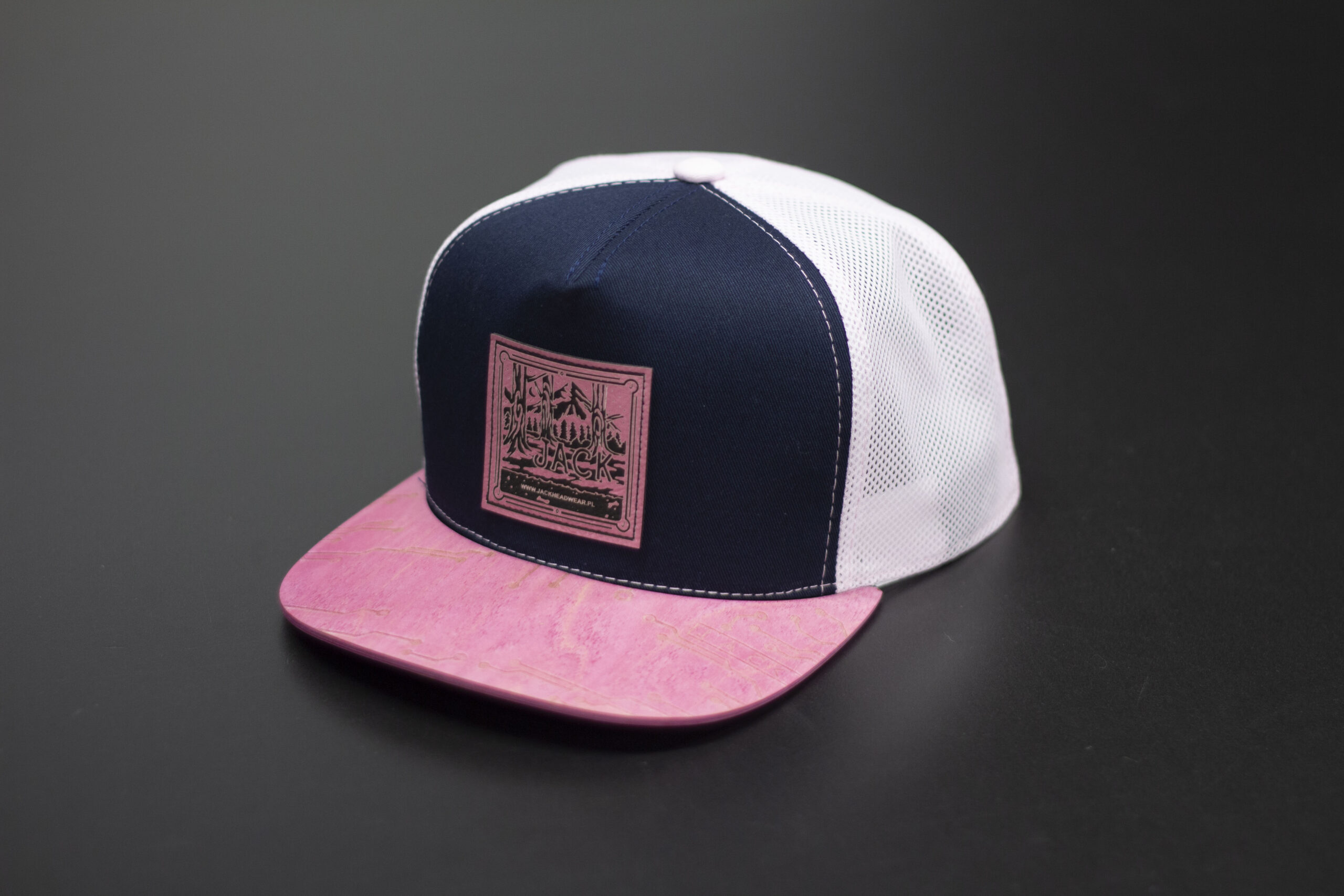 Czapka trucker w kolorze granatowym z białą siatką i różowym drewnianym daszkiem wykonanym z prawdziwego drewna. Model łączy outdoorowy styl z nowoczesnym streetwearem. Na froncie znajduje się różowa prostokątna naszywka z motywem górskim i logo Jack Headwear. Idealna na lato, wyjazdy, rower i codzienne noszenie.