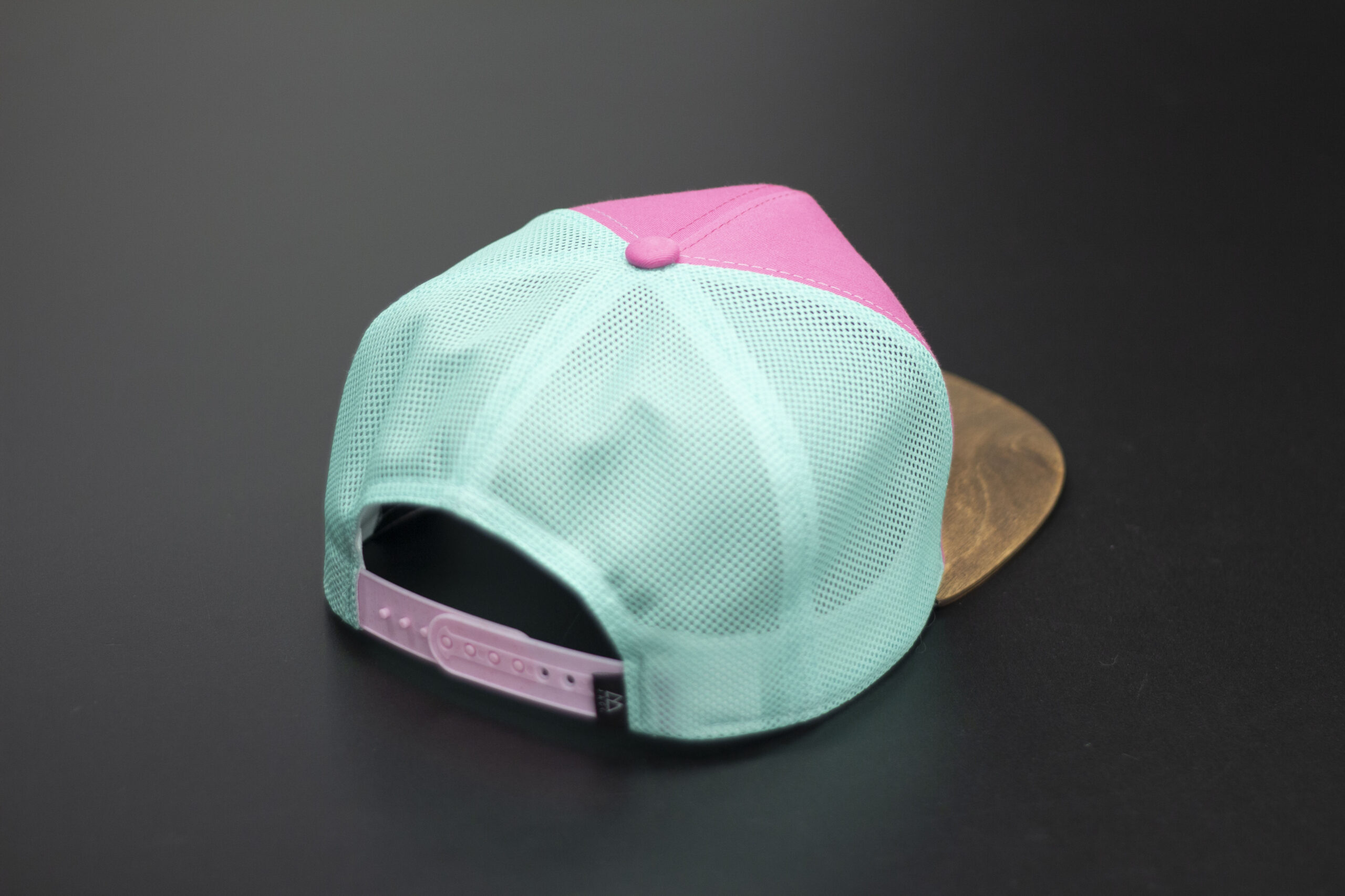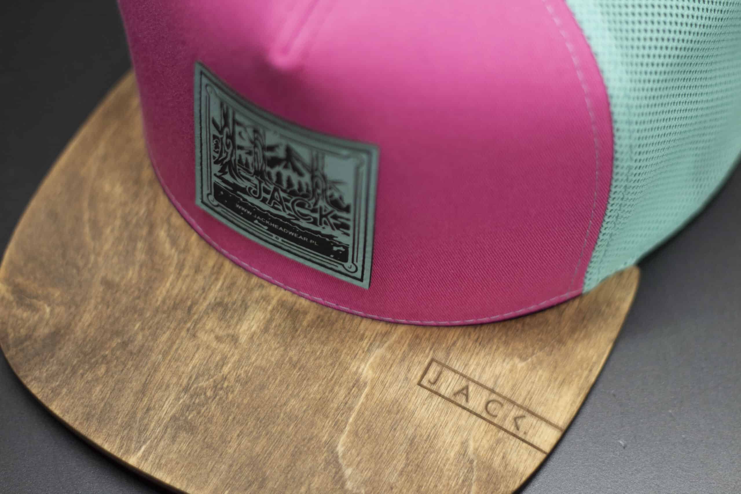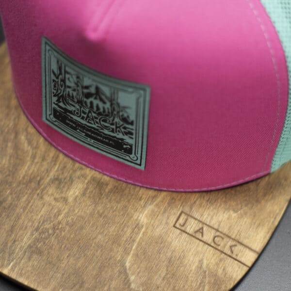 Czapka trucker w kolorze różowym z turkusową siatką i brązowym drewnianym daszkiem wykonanym z prawdziwego drewna. Na froncie znajduje się prostokątna naszywka z motywem górskim i logo Jack Headwear. Model wyróżnia się mocnym połączeniem kolorów i naturalnym wykończeniem. Idealna na lato, wyjazdy, rower i codzienne noszenie.