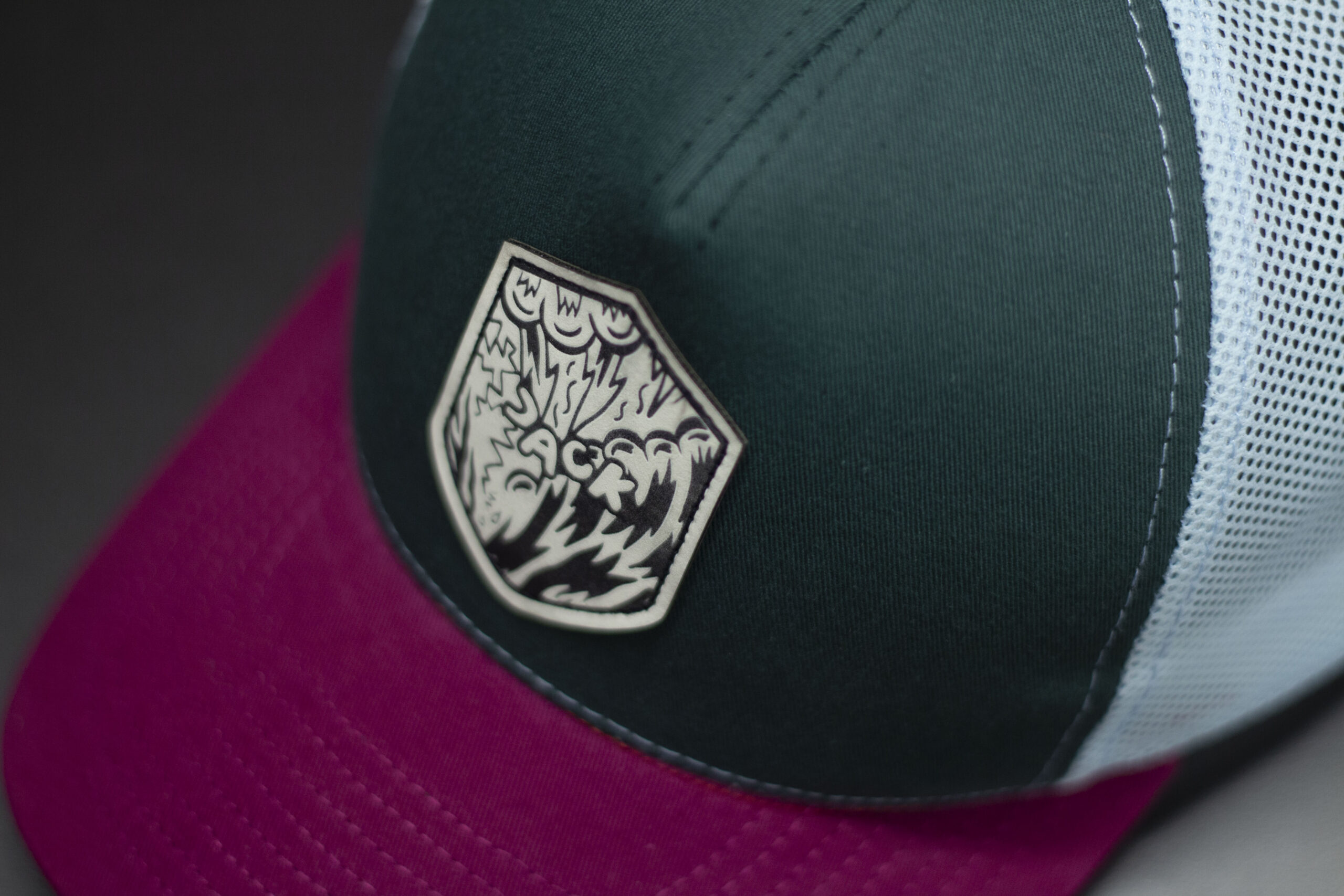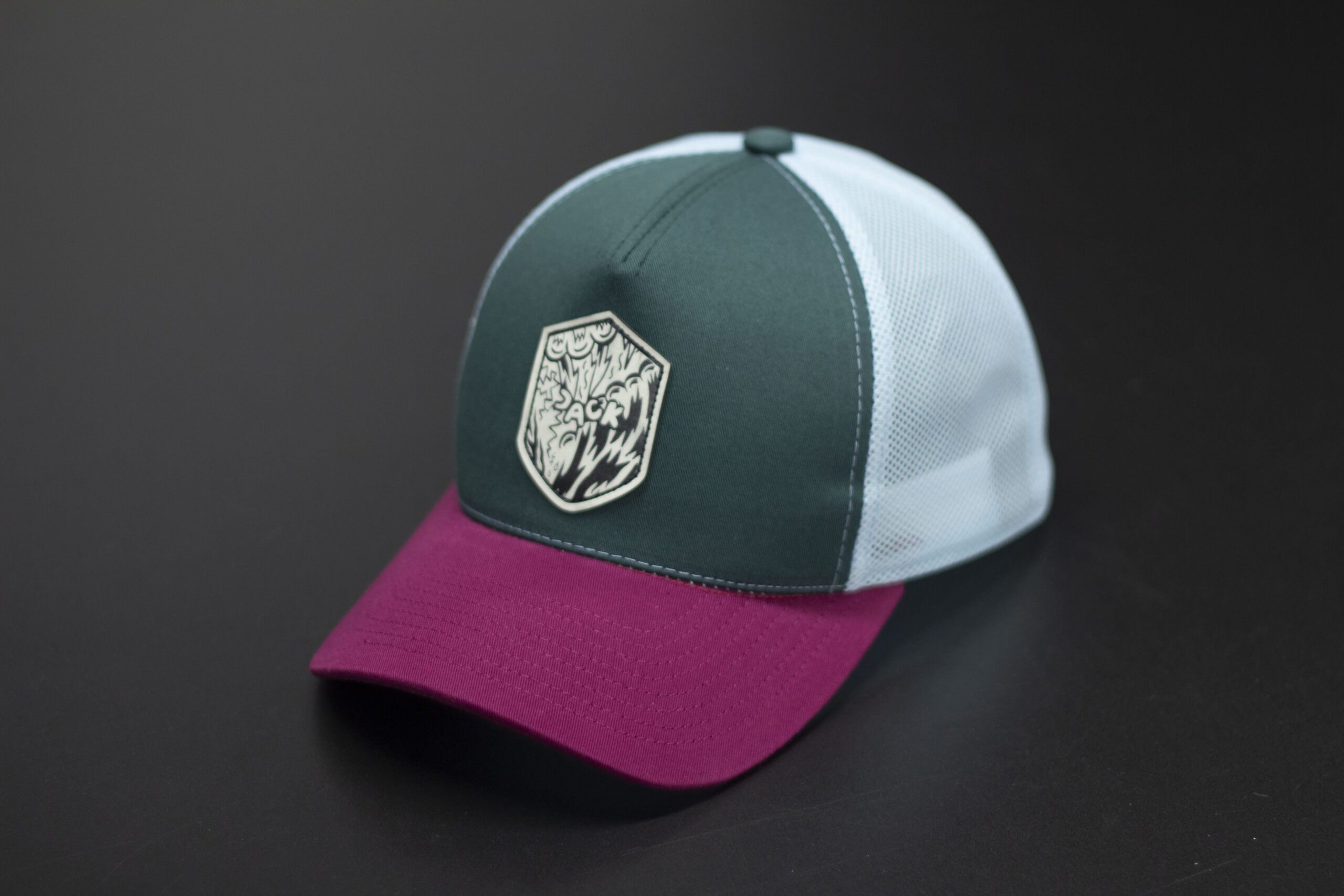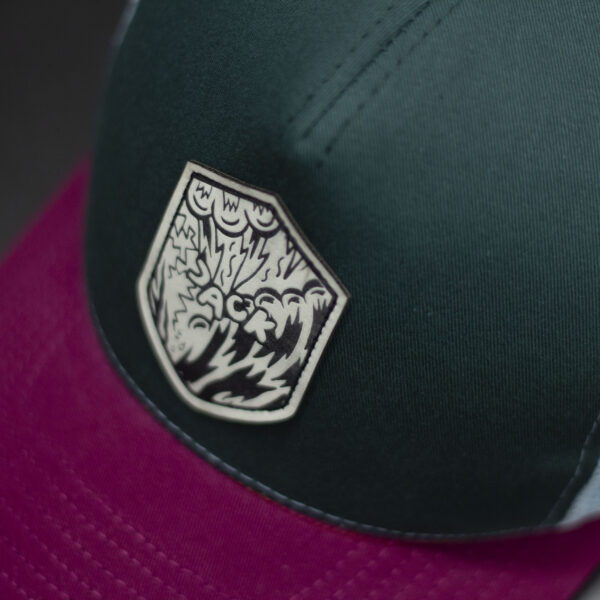 Czapka baseball w kolorze ciemnej zieleni z błękitną siatką i bordowym daszkiem. Na froncie znajduje się naszywka w kształcie tarczy z grafiką, która nadaje czapce charakterystyczny, outdoorowo‑streetwearowy styl. Mocne, kontrastowe połączenie kolorów sprawia, że model wyróżnia się w codziennych stylizacjach. Idealna na lato, wyjazdy, rower i codzienne noszenie.