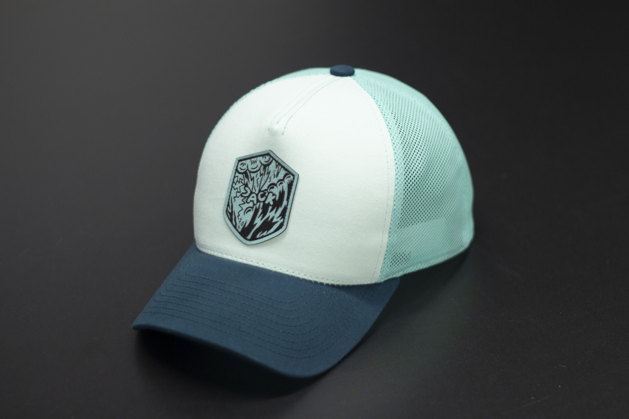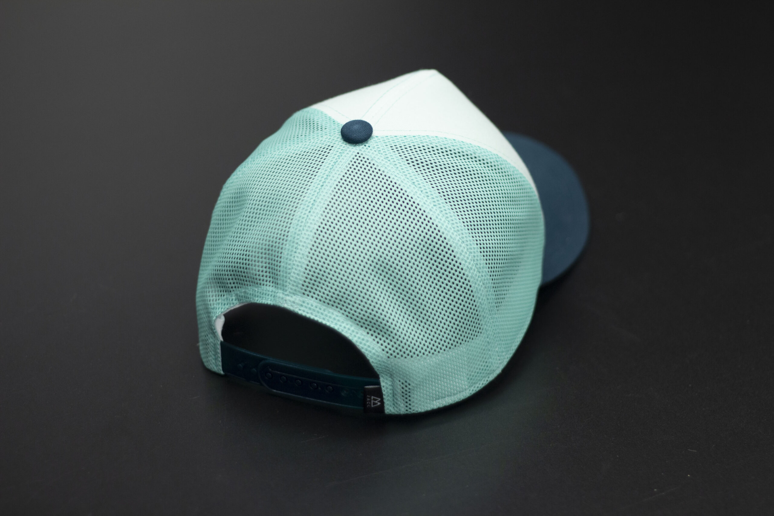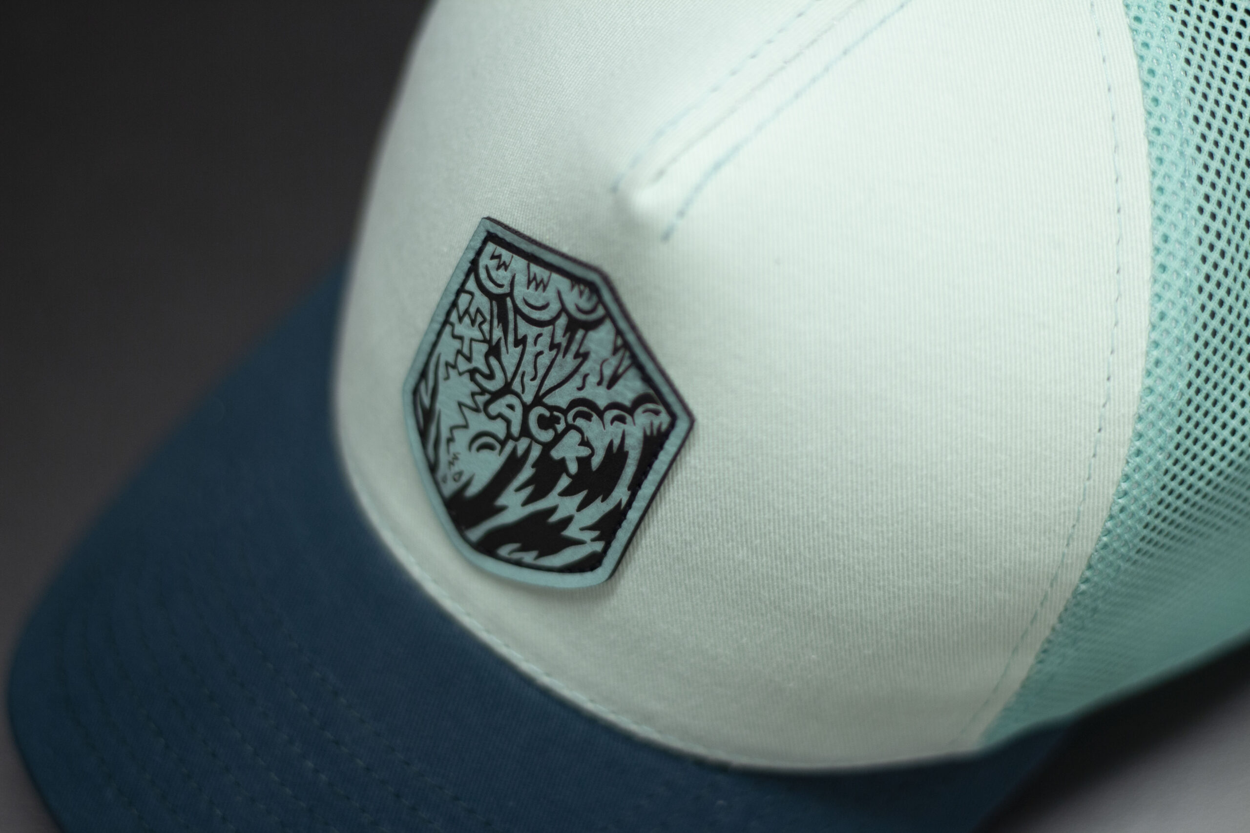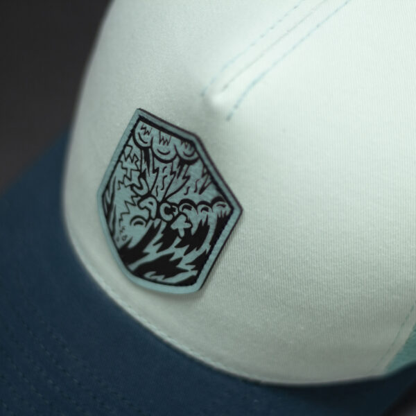 Czapka baseball w kolorze jasnoniebieskim z jasnoniebieską siatką i granatowym daszkiem. Na froncie znajduje się naszywka w kształcie tarczy z grafiką, która nadaje czapce wyrazisty, streetwearowy charakter. Połączenie dwóch odcieni niebieskiego z ciemnym daszkiem sprawia, że model jest czytelny, świeży i idealny na lato.