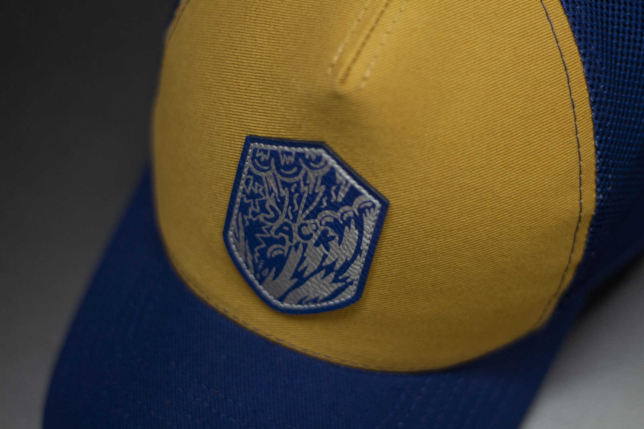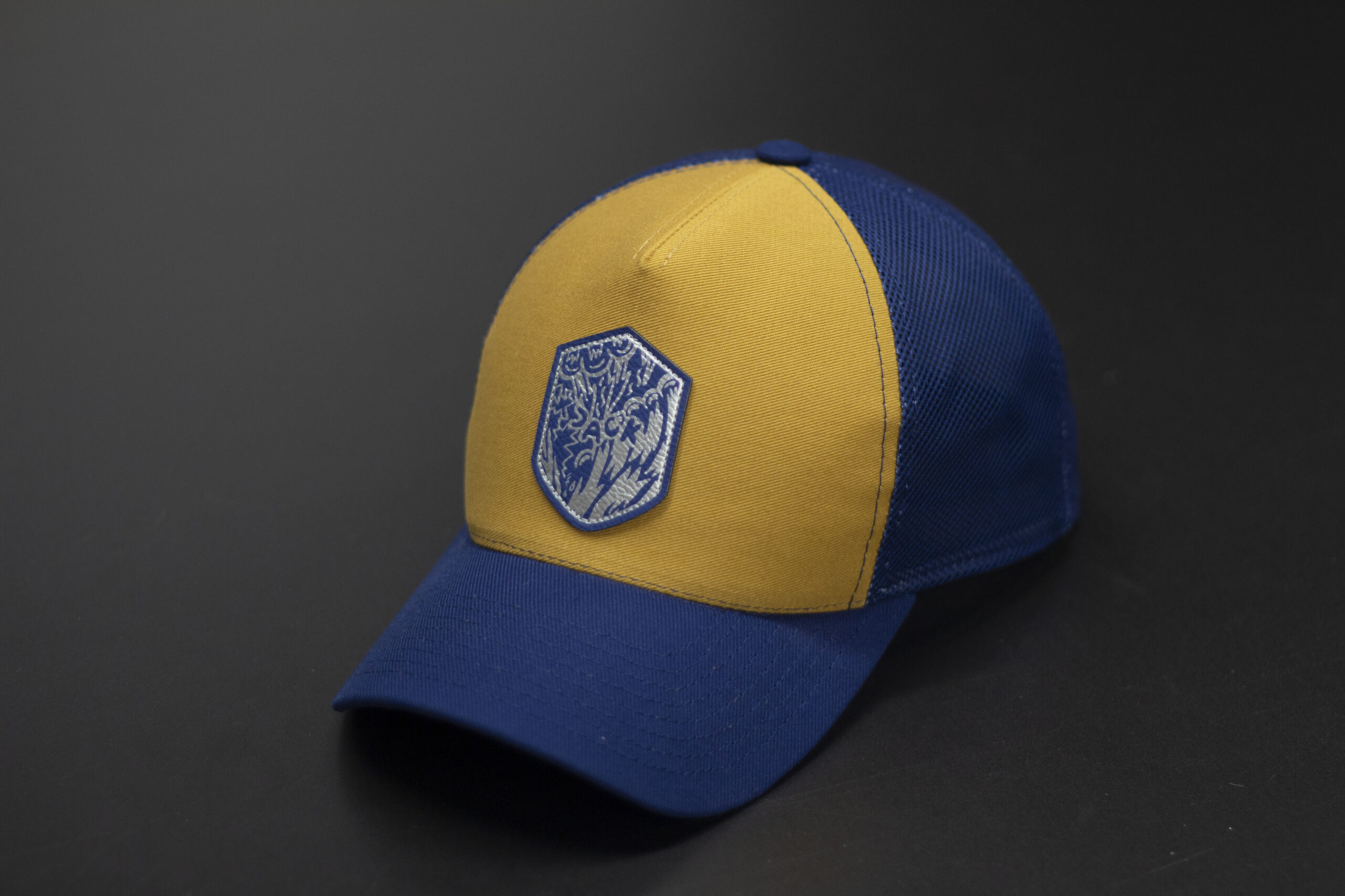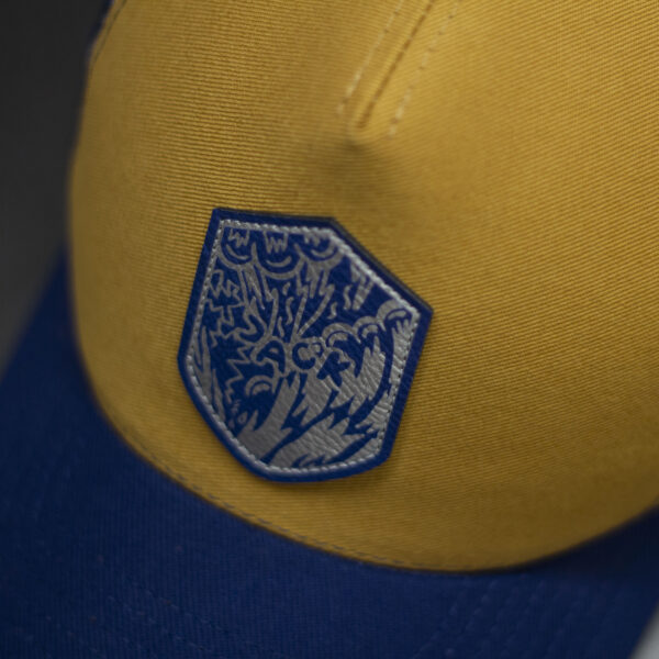 Czapka baseball w kolorze musztardowym z niebieską siatką i niebieskim daszkiem. Na froncie znajduje się naszywka w kształcie tarczy z grafiką, która nadaje czapce dynamiczny, streetwearowy charakter. Mocne, kontrastowe połączenie kolorów sprawia, że model wyróżnia się w codziennych stylizacjach i świetnie sprawdza się latem.