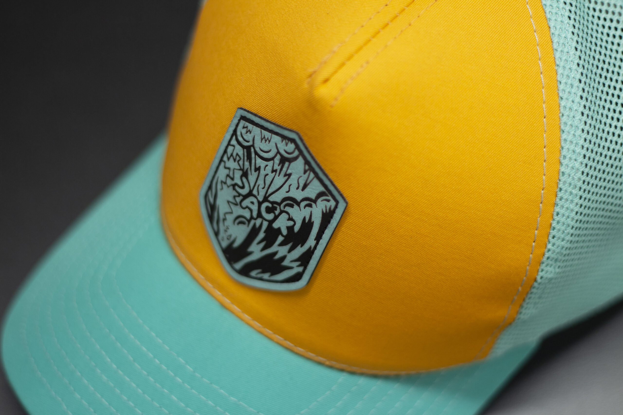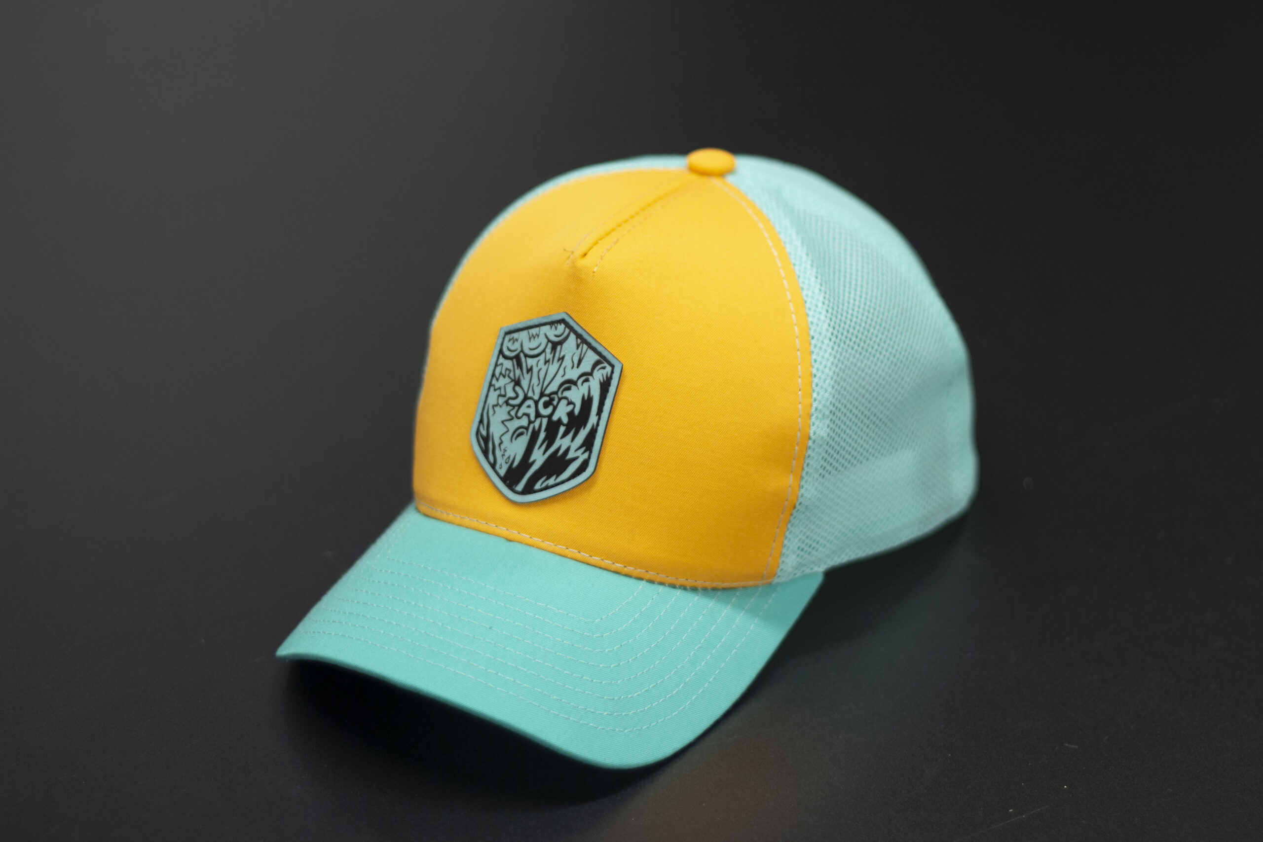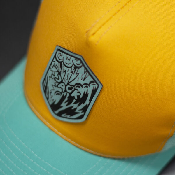 Czapka baseball w kolorze żółtym z turkusową siatką i turkusowym daszkiem. Na froncie znajduje się naszywka w kształcie tarczy z grafiką, która nadaje czapce wyrazisty, nowoczesny charakter. Mocne połączenie kolorów sprawia, że model wyróżnia się w stylizacjach streetwearowych i letnich. Idealna na lato, wyjazdy, rower i codzienne noszenie.