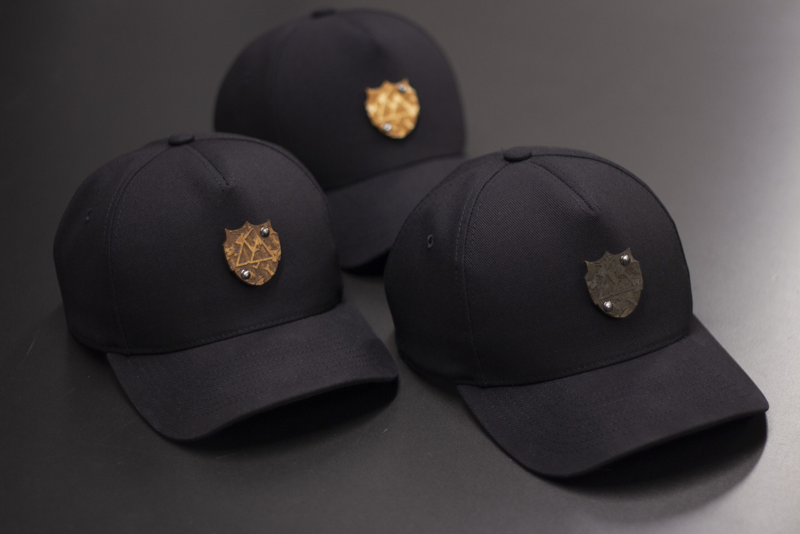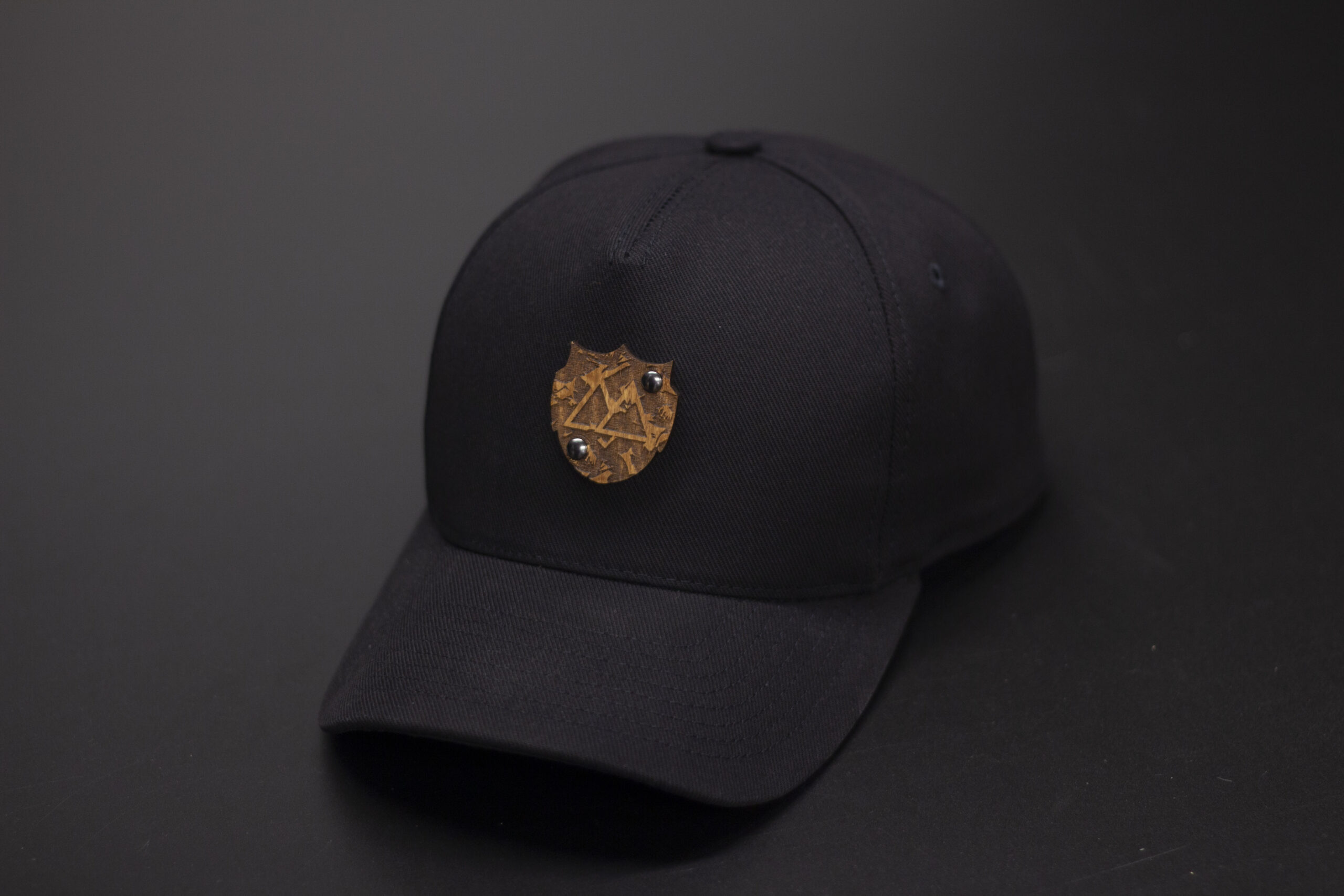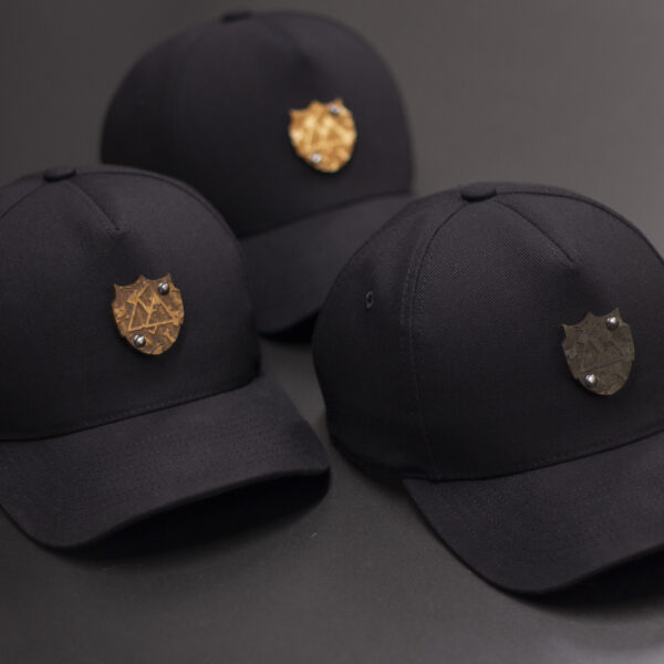 Czapka baseball w pełnej czerni — czarna czasza, czarna siatka i czarny daszek. Na froncie znajduje się drewniany emblemat w kolorze teak, mocowany nitami, który przełamuje monochromatyczny wygląd i nadaje czapce premium‑charakter. Minimalistyczna, elegancka, mocna wizualnie — idealna do codziennych stylizacji i streetwearu.