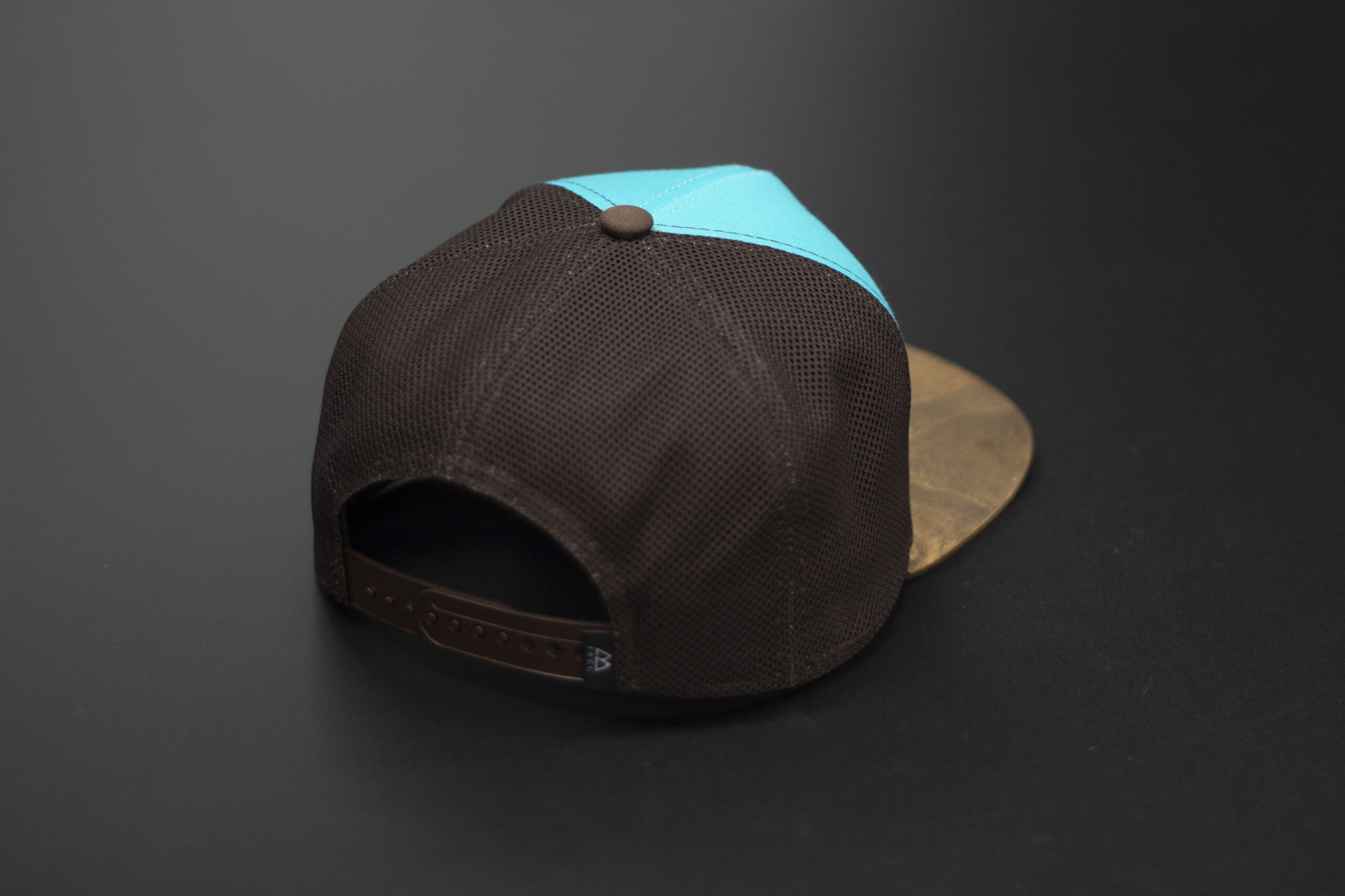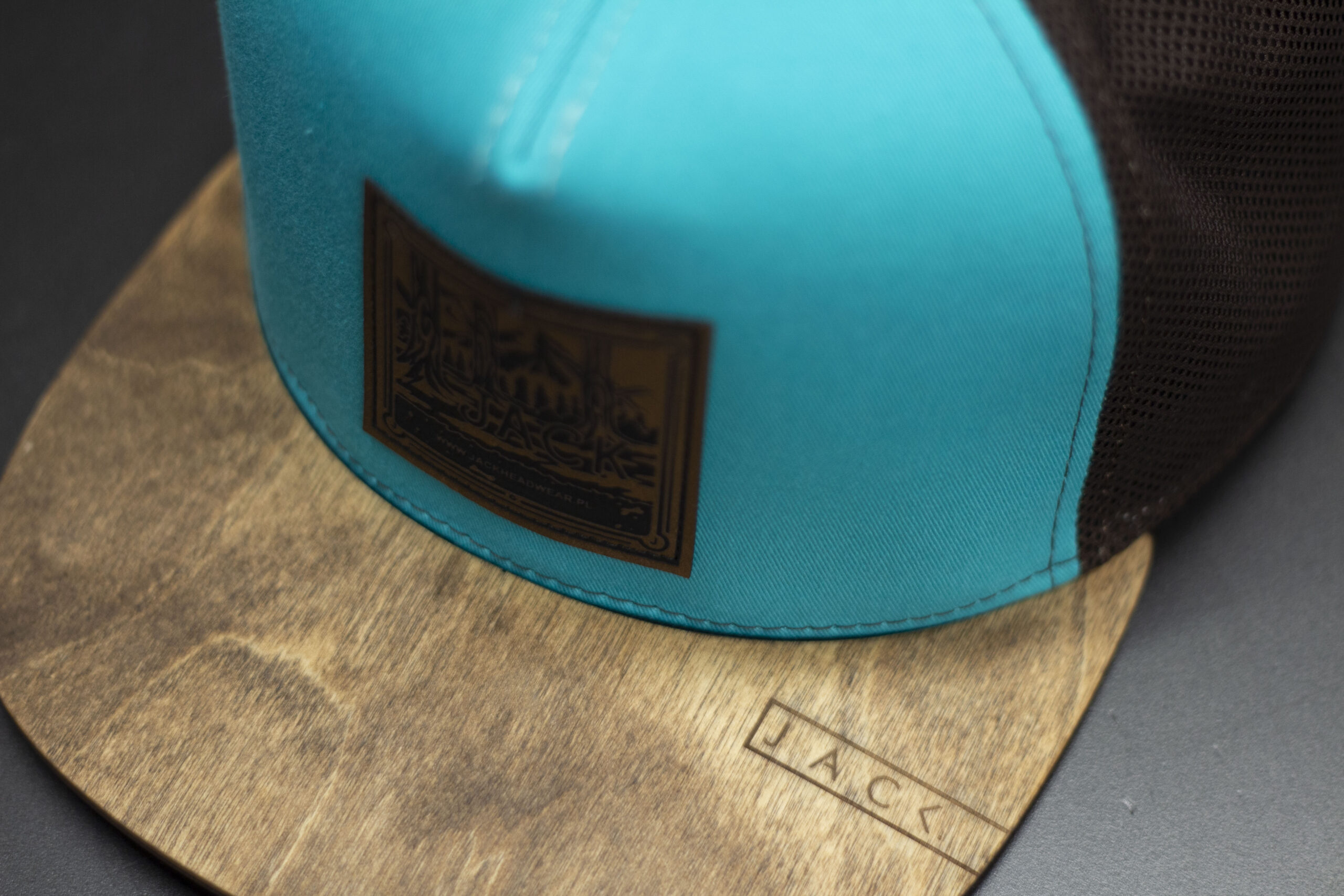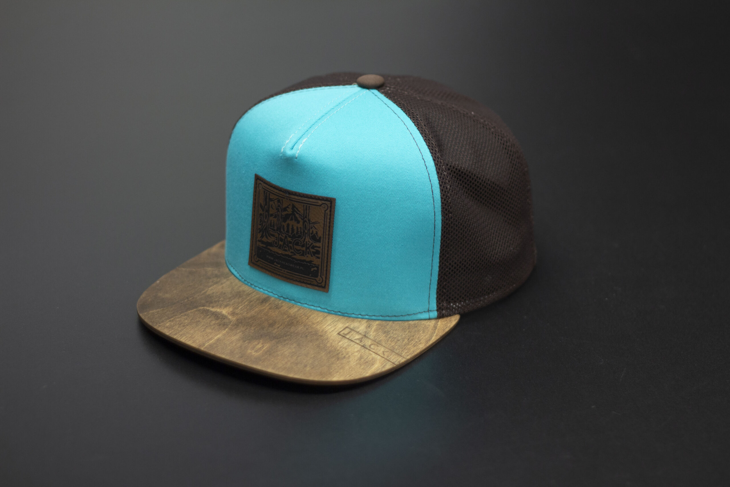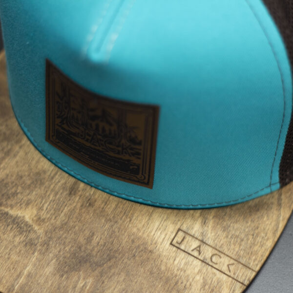 Czapka trucker w kolorze turkusowym z brązową siatką i brązowym drewnianym daszkiem wykonanym z prawdziwego drewna. Na froncie znajduje się prostokątna naszywka z motywem górskim i logo Jack Headwear. Model wyróżnia się kontrastowym połączeniem kolorów i naturalnym wykończeniem. Idealna na lato, wyjazdy, rower i codzienne noszenie.